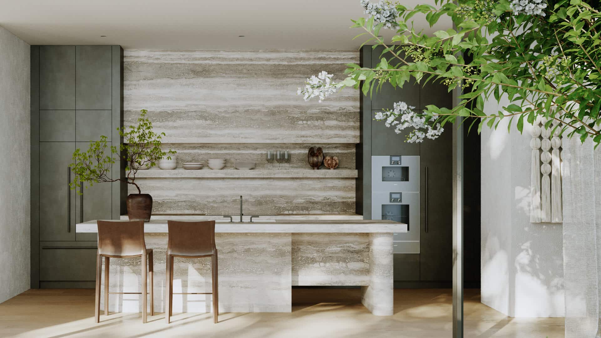 The material language is warm and layered, featuring bagged brick, antique satin brass, European Oak timber and natural stones. Full-height doors and a central light court introduce scale and openness, while solid columns and crafted thresholds create delineation without division.